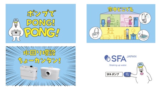 新CMは、SFAポンプが実際に導入されている施工事例から選別したケースをまとめ、テレビCMでおなじみのSNSでバズった曲と、カラフルでポップなキャラクターを通して、『SFAポンプを使えば、家中どこにでも簡単に水回りを新設できる』というメッセージをお届けします。