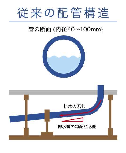 従来の工法では、これらの場所に既存の排水設備がなければ、大掛かりな工事が必要で、工事費が高くつき、工事日数もかかります。そのため、希望する場所に自由に水回りを設置することが難しい。。。