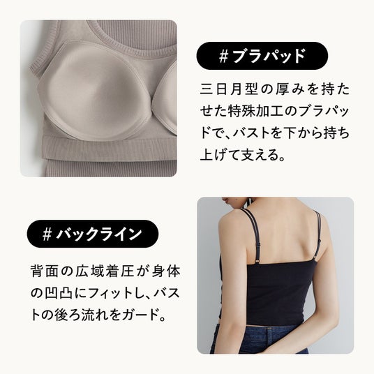 インナーとしてだけではなく、ウェアとして楽しんでいいただけるよう、生地は高見えする透け感のない素材を採用。伸縮性も重視しストレスフリーな着心地です。ストラップは細目のダブルストラップにすることでファッション性を高め、“華奢見え”も狙えます。また、ネックラインは、デコルテを美しく見せつつも、かがんだ時に谷間が見えないように計算されています。そして一番のポイントは、ナイトブラで培ったバストメイク力です。従来のカップ付きキャミソールは補正力が弱く、カップがフィットせずパカパカ動いてしまうことが課題でしたが、「BAMBI WATER」はナイトブラの補正力をキャミソールに統合。特許出願中の新技術によりノーワイヤーで楽な着心地でありながら、寄せて支えるホールド力と形を整える補正力を兼ね備えています。