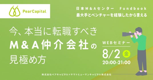 ヤマトヒューマンキャピタル株式会社(本社:東京都千代田区、代表取締役:堀江 大介)は、2024年8月2日(金)20:00よりオンラインにて、ウェビナー『今、本当に転職すべきM&A仲介会社の見極め方』を開催いたします。
