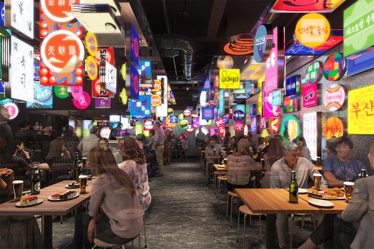『シンバシyokocho 武将 ~BUSHO~』と同様にアジア料理と都市部をつなぐ本エリア。日本全国の食を集めた「台所 日ノ本」、蕎麦と焼鳥の「繋(TSUNAGI)」、中華料理の「小龍」、韓国料理の「韓明洞」、タイ料理の「Soi Bangla」といった店舗が軒を連ね、各国のさまざまな看板が約800個設置されます。『武将』で日本各地の料理を楽しんだ後、2軒目に韓国料理店へ、といった『グランハマー』内での”はしご”ができるのも特徴です。