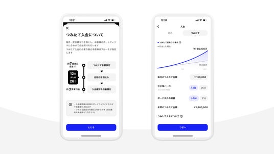 新たに導入された「つみたて投資機能」では、「Bloomo」アプリからの設定で、お客様の銀行口座からの定期引き落としを毎月3万円から設定できます。ボーナス月(最大年2回)には、引き落とし額を増額することも可能です。