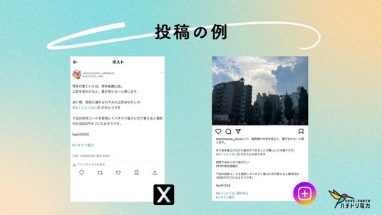 2.ハチドリ電力【公式】のアカウントで発信された投稿を引用ポスト、またはハッシュタグ「#なくしたくない夏がある」をつけて投稿。この際、招待コードの記載を忘れずにお願いします