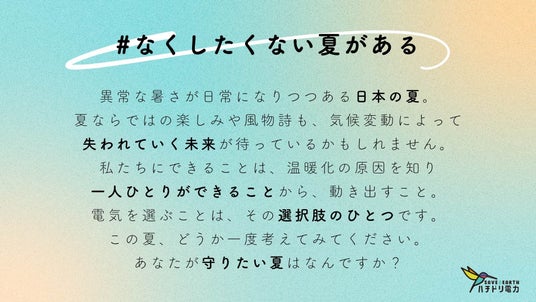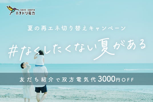 株式会社ボーダレス・ジャパン(本社:福岡県福岡市、代表取締役社長:田口 一成)が運営する自然エネルギー100%の電力小売事業「ハチドリ電力」は、記録的猛暑を更新している今夏、一人ひとりの力で気候変動へのアクションを促すことを目的とした自然エネルギー切り替えキャンペーンを実施いたします。7月31日(水)~8月31日(土)の1ヶ月間、「#なくしたくない夏がある」をつけたSNS投稿をみて招待コードを利用した新規契約者、またその紹介者に3,000円の割引特典を適用します。さらに、最も多く友だち紹介をしてくださった会員の方の電気代を1年間無料にします。