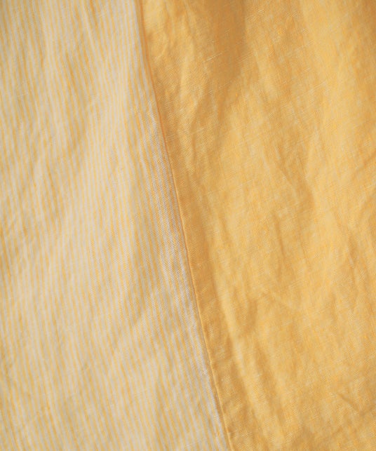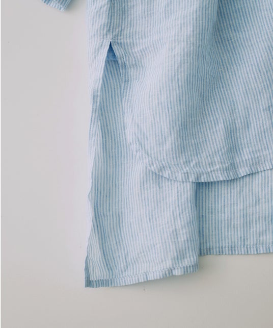 同色糸の糸色で織られたシャンブレー生地とストライプ生地を組み合わせてパターン配色にし、