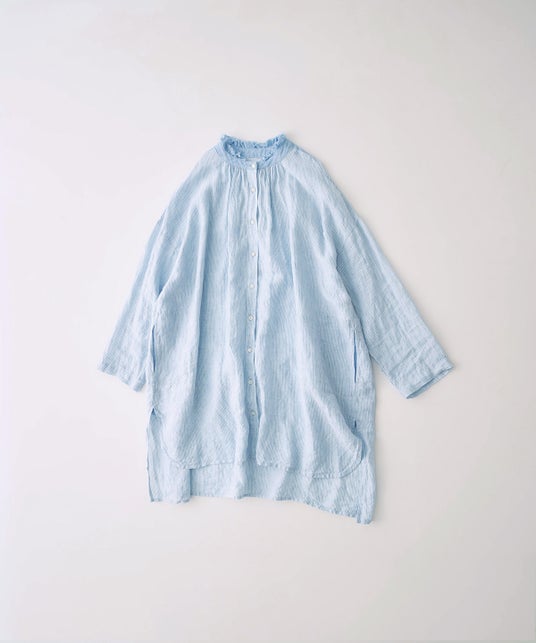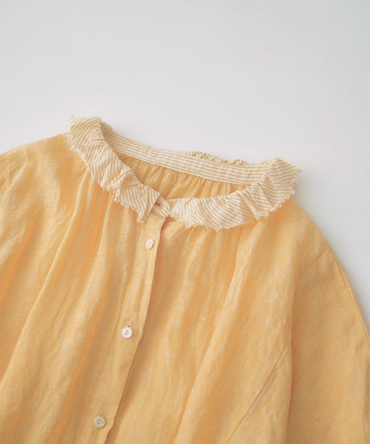 ラッフルデザインで襟元に特長を持たせ、ネックまわりに細やかなギャザーを効かせることで