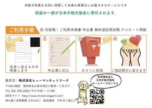 株式会社ヒューマンネットワーク(本社:愛知県名古屋市港区、代表:加藤司紀)は、介助犬育成の支援と啓発活動を支援するため、未来の希望日に手紙や写真を贈ることができる「時の便り」の10年保管を限定製作しクラウドファンディングサイト「READYFOR」にて発売いたします。募集期間は2024年7月23日(火)~9月11日(水)で、募集金額は10万円です。
