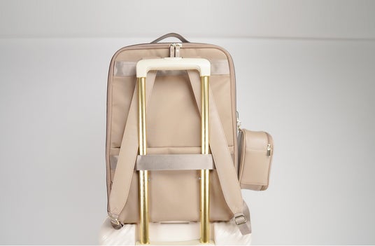 出張や遠征に便利なセットアップベルト付きで、リュックをスーツケースに固定できます。