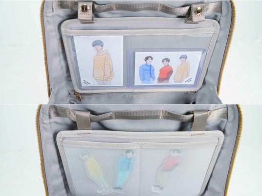 お気に入りグッズの見せる収納ができる、着脱可能な「両面ディスプレイポケット」が付属します。片面はクリアで片面はメッシュになっており、写真、アクリルスタンド、缶バッチなど目で見て楽しみたいグッズの収納に便利です。