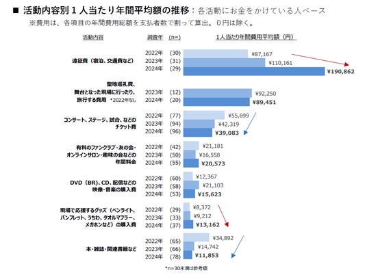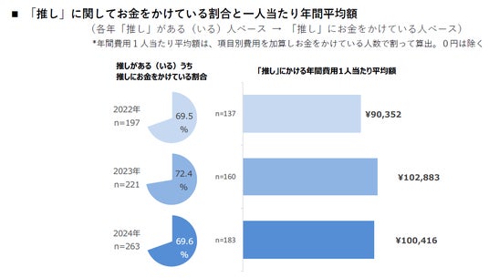 「推し」あり(いる)の人のうち、「推し」に関してお金をかけている人の割合は69.6%、かけている年間平均額は10万416円で昨年から横ばい。活動内容別に費用をみると、「遠征費」は年々増加。