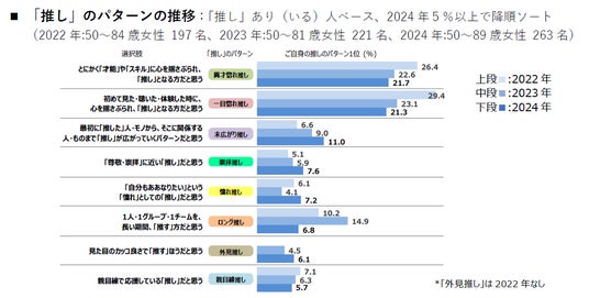 推しのパターンとしては、「異才惚れ推し」と「一目惚れ推し」がこの3年間2~3割と多い。「末広がりが推し」が年々増え、今年は1割を超えた。