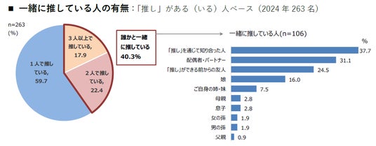 「推し」がある(いる)のは46.1%で、昨年の47.9%とほぼ変わらず。「推し」がある(いる)人のうち、誰かと一緒に推している人は約4割で、推し友や配偶者・パートナーの比率が高い。