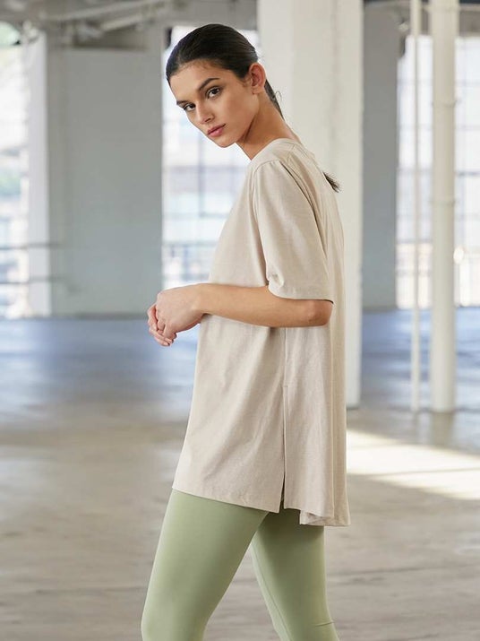 汗をかいてもサラサラが続く吸水速乾性に優れたアンダールだけの特殊素材を使用したTシャツ。気になるヒップとYゾーンをカバーしてくれるレギンスコーデの必須アイテムです。