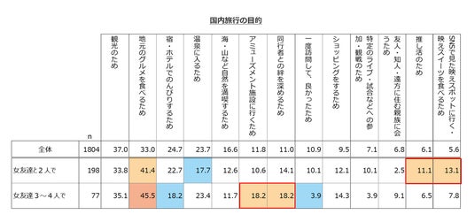 国内旅行の目的を見ると「女友達と2人」では「推し活」「SNSで見た映えスポットに行く・映えスイーツを食べる」、「女友達と3~4人」では「アミューズメント施設に行く」「同行者との絆を深める」が他よりも高い傾向です。