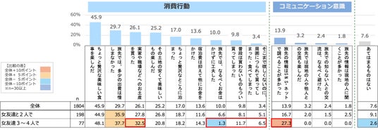 また国内旅行での消費行動を見ると「女友達3~4人」では「女友達と2人」と比較し積極的な消費行動をしていることが分かります。行動別でみると「多少の出費は惜しまなかった」や「お土産購入」が高くなっています。