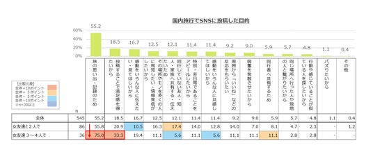 SNSに投稿する目的では「女友達3~4人」の75%が「旅の思い出・記録のため」と回答し「女友達と2人」と比較し20pt以上高い結果に。