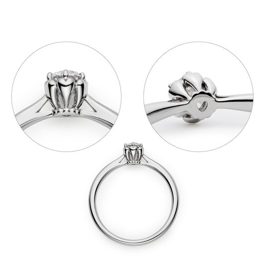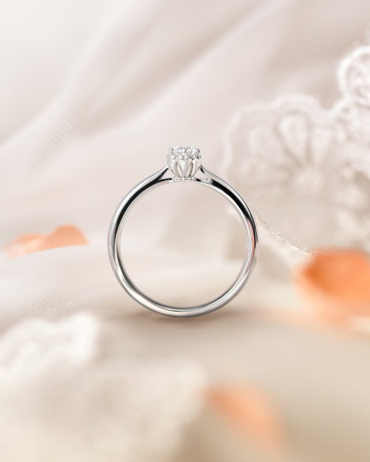 センターストーンを取り巻く6つのハートの石座が美しいフリルの形を描き、ミルグレインをほどこした石座の裏側に隠れている小さなハートの光穴がさりげない甘さを演出します。