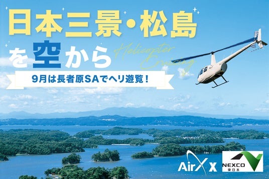 株式会社AirX(本社:東京都千代田区、代表取締役:手塚 究、以下「AirX」)は、東日本高速道路株式会社(本社:東京都千代田区、代表取締役:由木 文彦、以下「NEXCO東日本」)と連携し、東北自動車道 長者原(ちょうじゃはら)サービスエリア(SA)(上り線)を離着陸地とする「ヘリコプター遊覧プラン」を8月1日(木)から販売開始することをお知らせいたします。