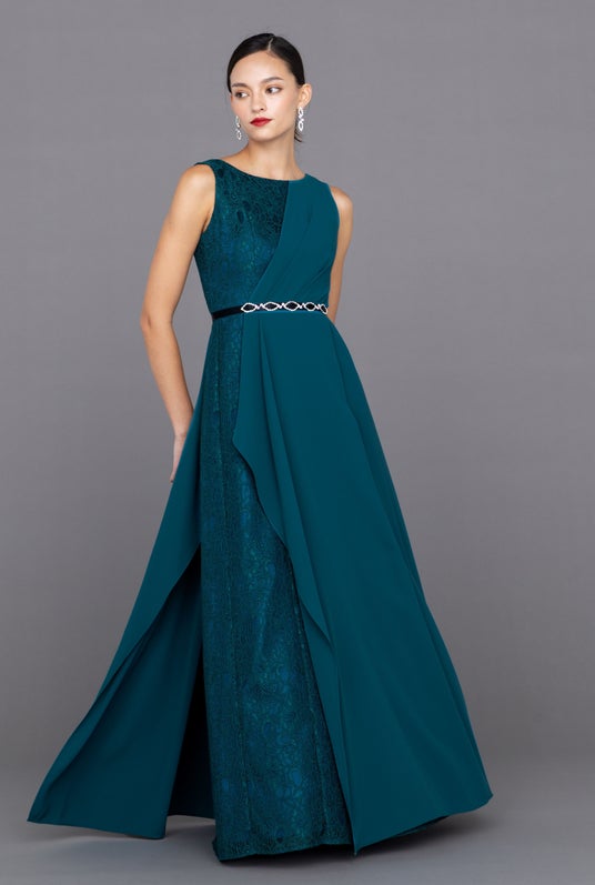 異素材の生地を組み合わせたデザインで、唯一無二のエレガントなドレス。