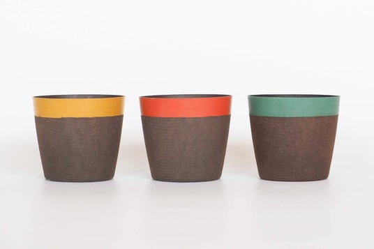こっくりと深みのある黄色、あんずの実のようなジューシーなオレンジ、生い茂る木々をイメージした 青みがかった緑色 の3色の色漆(いろうるし)をカップのリムの部分にほどこしました。カップ同士をスタッキング(積み重ね)すると、カラーの口縁部分が見えるのもこだわりポイントです。