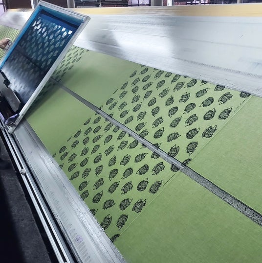 手捺染は捺染台に熱を入れる(生地の染料の乾きを早くするため)ので、工場内は40℃近くの室温まで上がることもあるそう。
