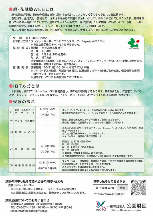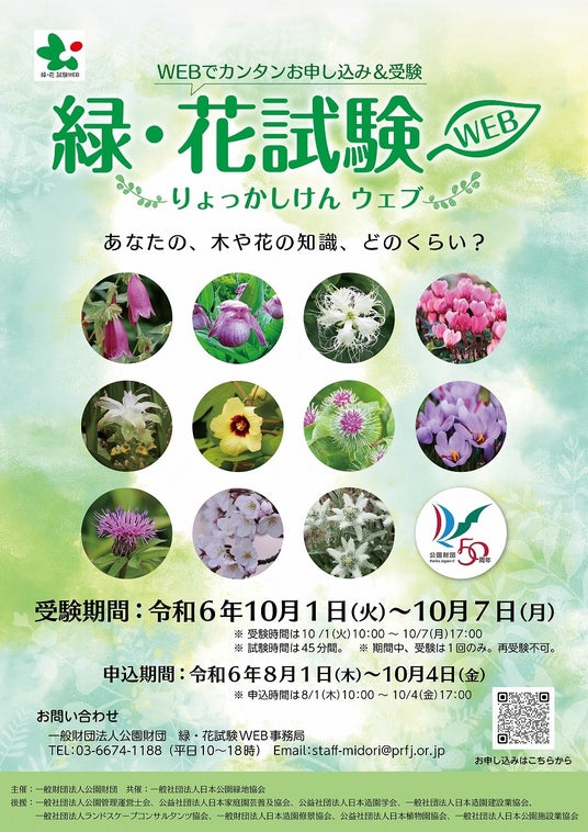 自然科学 、生活文化、芸術など、さまざまな分野の問題にチャレンジして、あなた がどれだけバランス良く知識を保有しているのか確認いただけます。過去にマークシート式の「緑・花試験」として開催していましたが、今年、(一財)公園財団設立50周年を記念し、インターネットを利用したオンラインで開催します。