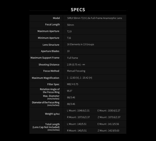 SIRUI 50MM T2.9 1.6x フルフレームアナモルフィックレンズ