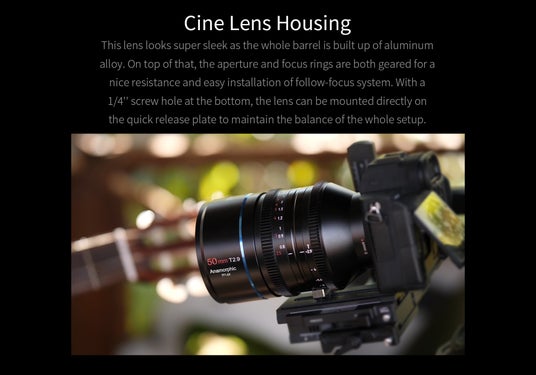このレンズはアルミ合金製のバレルで構成されており、非常に洗練された外観を持っています。さらに、絞りリングとフォーカスリングはともにギア付きで、適切な抵抗感を提供し、フォローフォーカスシステムの取り付けも容易です。底部には1/4インチのネジ穴があり、クイックリリースプレートに直接取り付けることで、全体のバランスを維持できます。