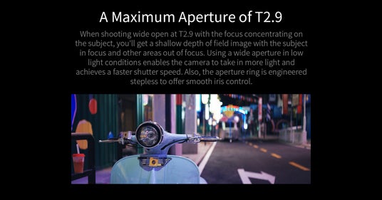T2.9の広絞りで撮影し、被写体に焦点を合わせると、被写体がシャープに焦点が合い、他の部分はボケた浅い被写界深度の画像が得られます。広い絞りを使用することで、低光量条件下でも多くの光を取り込み、より速いシャッタースピードを実現します。また、絞りリングはステップレスで設計されており、滑らかなアイリスコントロールが可能です。
