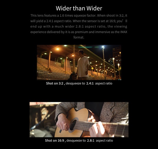 このレンズは1.6倍のスクイーズファクターを備えており、3:2で撮影した場合には2.4:1のアスペクト比が得られます。センサーを16:9に設定すると、さらに広い2.8:1のアスペクト比が実現でき、IMAXフォーマットに匹敵するプレミアムで没入感のある視覚体験を提供します。
