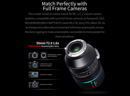 このモデルは、RF、L、E、Zマウントカメラシステムに対応するネイティブマウントで提供されており、Panasonic S1H、RED KOMODO、RED V-RAPTOR ST、Canon R5、C70、Sony FX3、Nikon Z6などのフルフレームカメラと互換性があります。ブランドのフルフレームアナモルフィックレンズの手頃な代替品として、このレンズはアナモルフィックレンズをより多くの人々や状況にアクセス可能にするでしょう。