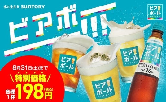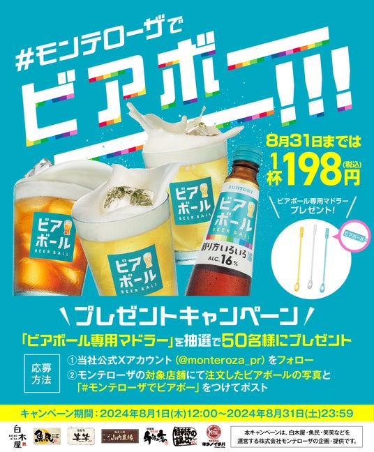 株式会社モンテローザ(本社:東京都杉並区、代表取締役:大神輝博)は、2024年8月1日(木)から2024年8月31日(土)までの期間に「白木屋」「魚民」「目利きの銀次」「山内農場」など全国の当社対象店舗で「サントリー”ビアボール”」を期間限定特別価格(※1)として1杯198円(税込)で提供します。