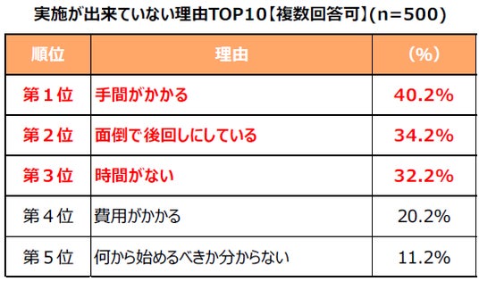 また、上記のような検討事項についてなぜ実施ができていないのかを聞いた結果、第1位は「手間がかる」(40.2%)となり続いて2位が「面倒で後回しにしている」(34.2%)、3位が「時間がない」(32.2%)となりました。この結果から、収納をするにあたって重視されていることは費用ではなく、どれだけ効率よく収納できるかという点だと考えられます。