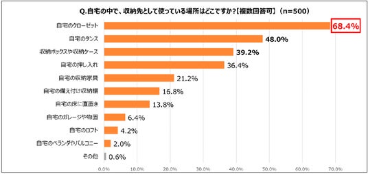 ご自宅での収納先として使用している場所を尋ねたところ、「クローゼット」と回答した人が68.4%と最も多く、続いて、「タンス」(48.0%)、「収納ボックスや収納ケース」(39.2%)という結果になりました。収納先では、荷物が多く入る場所や、必要に応じて調整できる場所が好まれている傾向にあると考えられます。