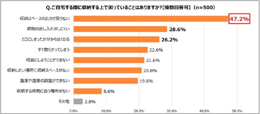 自宅で収納する上で困っていることを聞いたところ最も多かったのは、「収納スペースが足りない」(47.2%)、次いで、「荷物の出し入れがしにくい」(28.6%)、「どこにしまったのか分からなくなってしまう」(26.2%)など広さの悩み以外にも収納する位置や収納環境に関しての悩みが多いことがわかりました。
