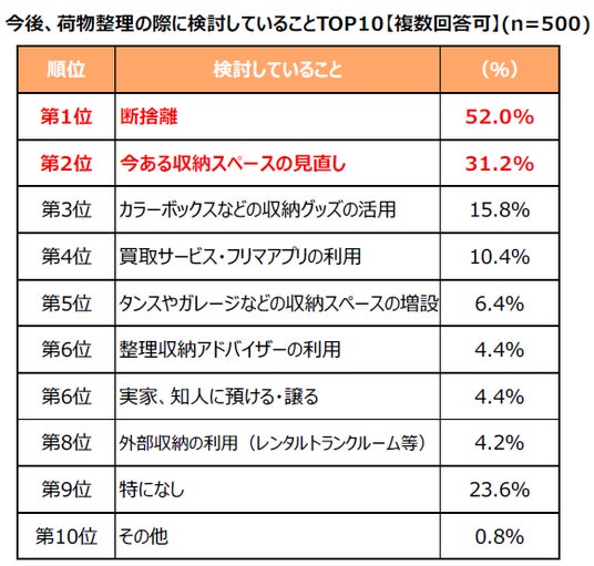 ・今後の荷物整理の際に検討していることとして、「断捨離」(52.0%)が最も多い結果に