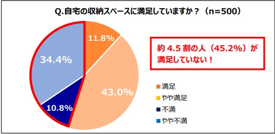 500 名を対象に、自宅の収納スペースに満足しているか尋ねたところ、「満足している」と回答した人が全体の約5割(54.8%)に対して約4.5 割(45.2%)が「不満」と感じていることが明らかになりました。