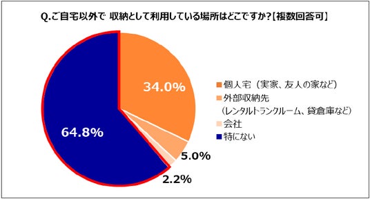 さらに、自宅以外での収納として利用している場所について尋ねたところ、収納先としては、「個人宅(実家、友人の家など)」(34.0%)が最も多い結果となりました。また、「特になし」と回答した人が64.8%と最も多く、外部の収納先を持っていない人が多いことが分かりました。