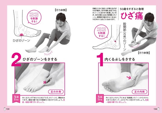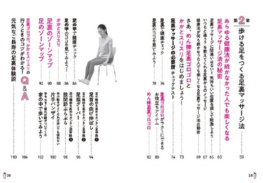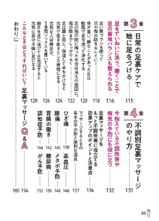 超簡単メソッド「足裏ゴロゴロ」「かかとスリスリ」で足裏ケアに興味を持ち、もっとしっかりケアしたいと思った人におすすめの「不調別・足裏マッサージ」も紹介しています。腰痛、ひざ痛、高血圧、糖尿病など多くの人が悩みとして抱える症状を足裏マッサージで解決。足裏には体中の部位と対応した反射区があり、それぞれの不調に応じた反射区を刺激することで、体が良いほうに向かっていきます。足裏のゾーンMAPを参考に、足裏を刺激する方法を写真でわかりやすく解説しています。また、日頃あまり注目されていない足の洗い方や日常のケア方法についても紹介しています。