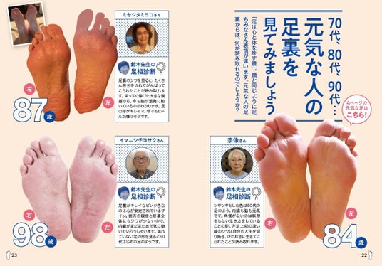 さらに、このメソッドを実践していただいた70~90代の方の体験談と足裏の写真も紹介。元気に自分の足で歩けているご高齢の方の足裏診断を鈴木きよみさんが行い、紹介するコーナーもあります。いきいきとご自身の生活を楽しんでいる元気な方のエピソードは見ているだけでこちらも元気がもらえ、同じようにやってみよう!という気持ちにさせてくれます。