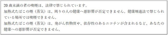 BATグループでは、たばこ製品のマーケティングを適切に実施するために国際的な自主規準を設定しています。そのため消費者に対するたばこ製品に関するすべてのコミュニケーションには、20歳未満の方へのコミュニケーションをお控えいただくとともに、「喫煙と健康に関する注意文言」を表示することを関係各位にお願いしております。加熱式たばこに関しては、記事掲載していただく際には、「健康に関する注意文言」が表示されるようご配慮いただきたく存じます。ご協力の程、何卒よろしくお願い申し上げます。