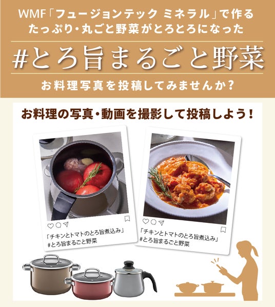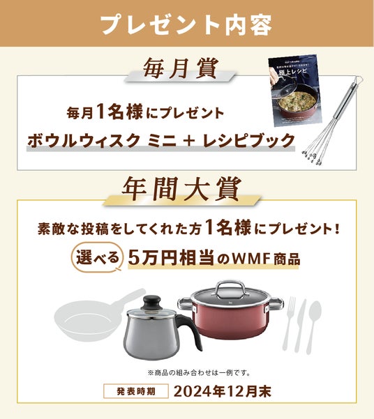 この度の投稿キャンペーンでは、まるごとたっぷりの野菜がとろける食感と旨みあふれる、“とろ旨まるごと野菜”レシピを作ることが出来る「フュージョンテック ミネラル」を使った料理を募集します。投稿キャンペーンにご応募いただいた方の中から、”毎月賞”として抽選で毎月1名様に「ボウルウィスク ミニ21cm」と「フュージョンテック ミネラルのレシピ本」をセットでプレゼントします。さらに、”年間大賞”では素敵な投稿をした方の中から1名様に選べる5万円相当のWMF商品を贈呈します。