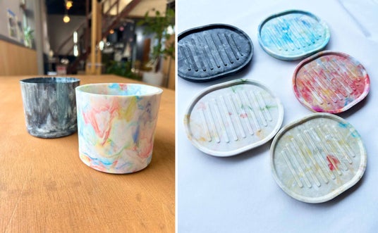 マーブル模様が特徴のペットボトルキャップをアップサイクルした雑貨に新しいラインナップが登場