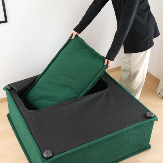 座面の裏側にクッションを収納できるスペースを用意。チャックを開けると付属のクッションがピッタリ収まるので、お部屋をスッキリ魅せたい時や引越しの時などにも便利です。