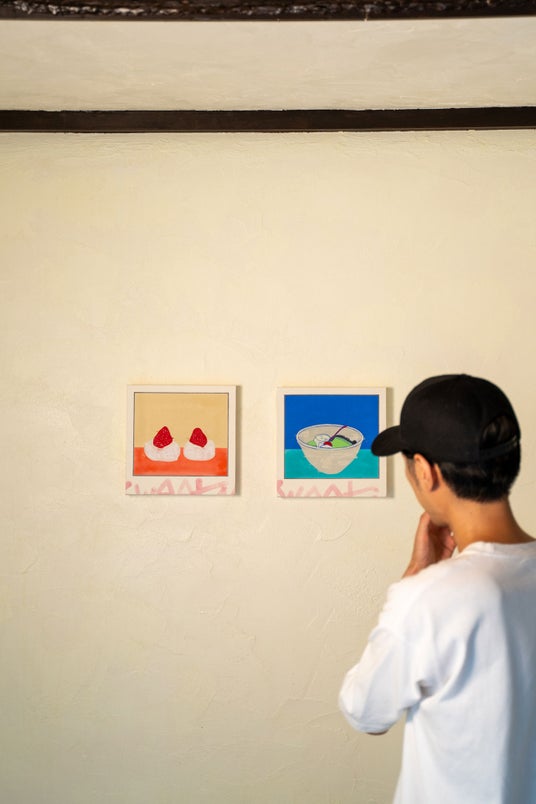 両店舗様の商品をデザインとしてではなく、文化や背景を踏まえた上で、日本画 × ストリートカルチャーのひとつとして、日本の菓子文化で繋がる作品と展示を目指しました。