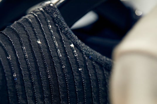 エンブロイダリーのニットは、手作業でビジュービーディングをし、トップスのネックラインは、アクセサリーとのバランスを考えた位置で調整、オケージョン向けのジャケットは、フロントホック部分の隙間が気になる、女性ならではの感覚であて布をプラスし、スカートはタックを入れ、柔らかく見えるように表現。