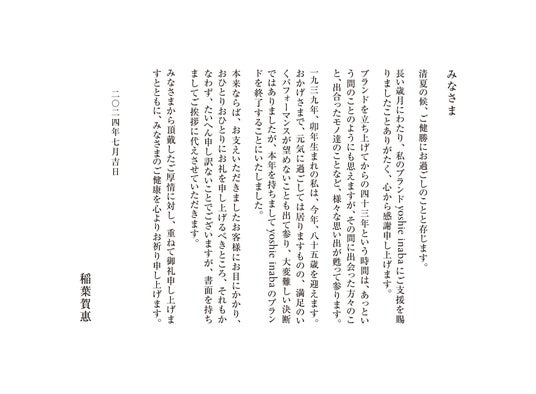 最後になりましたが、『yoshie inaba』ブランドをご支援・ご愛顧頂きました皆様のご厚情に、心より深く御礼申し上げます。本当に有難うございました。