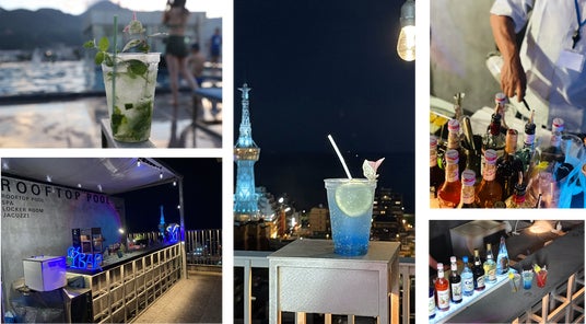 昨年もお客様に大好評だった、プールサイドで夏らしいオリジナルドリンクが楽しめるルーフトップバーが夏季限定で今年もオープンしました。雄大に広がる別府湾を前に、澄み渡る青い空から赤く染まる夕日へ移り変わる風情や、ライトアップされた別府タワーが浮かび上がる夜景を眺めながら、様々なシチュエーションで爽やかなオリジナルドリンクをお楽しみください。