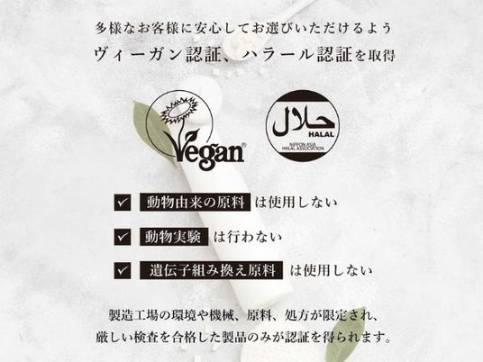 多様なお客様に安心してお選びいただけるようヴィーガン認証、ハラール認証を取得し、グローバルな拡大を目指します。