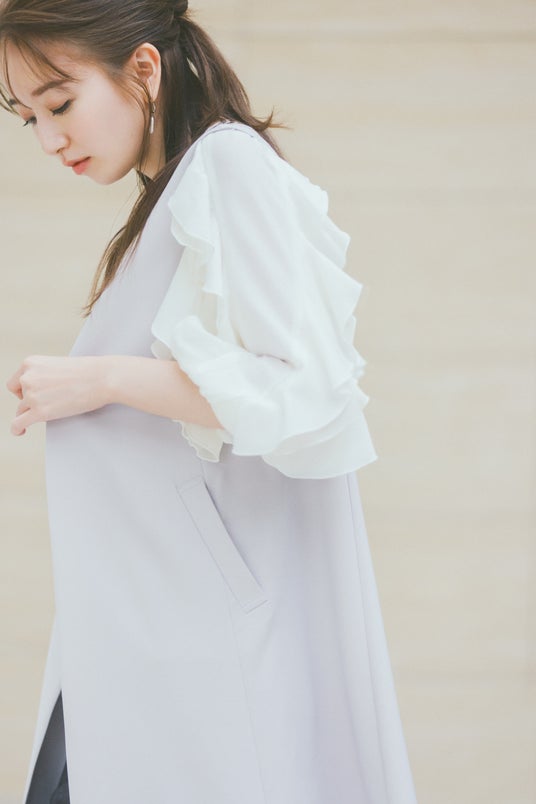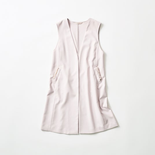 甘さのあるトップスと合わせる時は、ジレのポケットからパールを取り外して。